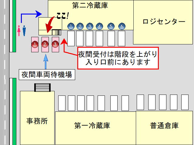 車両待機場所のご案内 夜間車両待機場所につきましては、上図の赤丸①~③までが車両待機場所となります。 満車の場合はお近くに道の駅等ございますので、そちらをご利用ください。 朝8:00時頃から順次誘導致します。